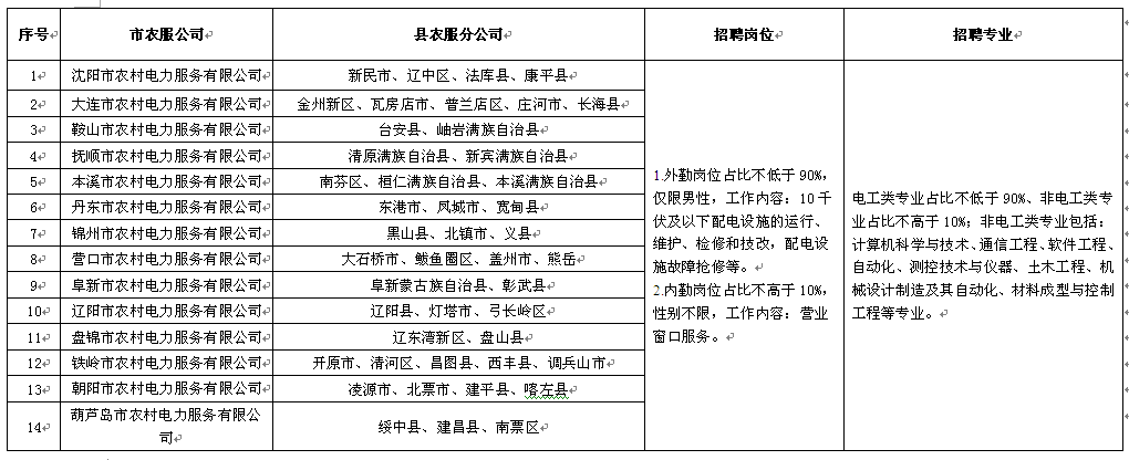 因业务发展需要,辽宁省各市农村电力服务有限公司联合开展2021年招聘工作,现将有关事项公告如下。